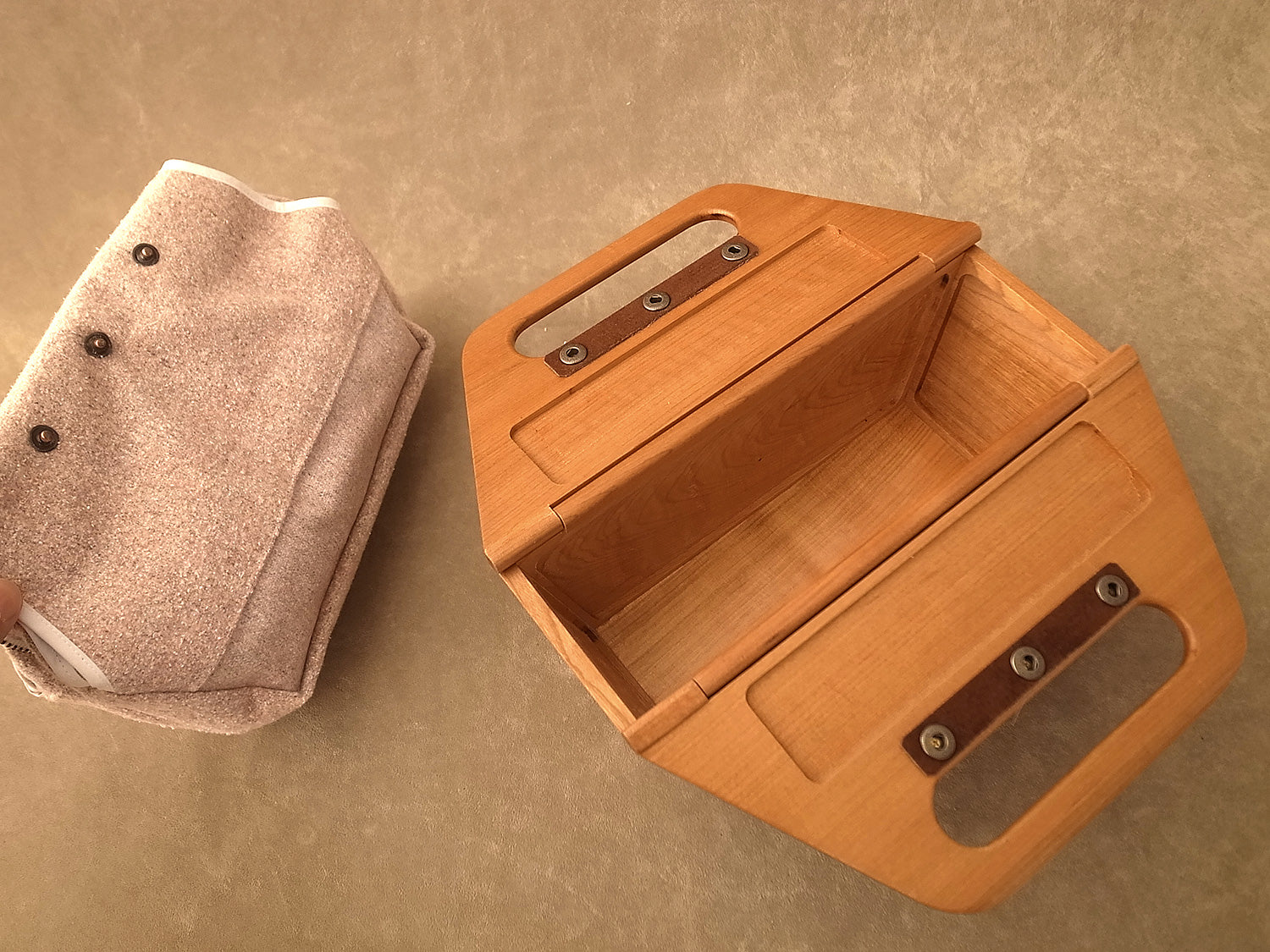 Made with cherrywood and local fabric from Hamamatsu, Shizuoka Prefecture, this handbag goes with any outfit. The removable inner-purse is made with unique fabric of cotton, silk, angora and nylon blend. 800g