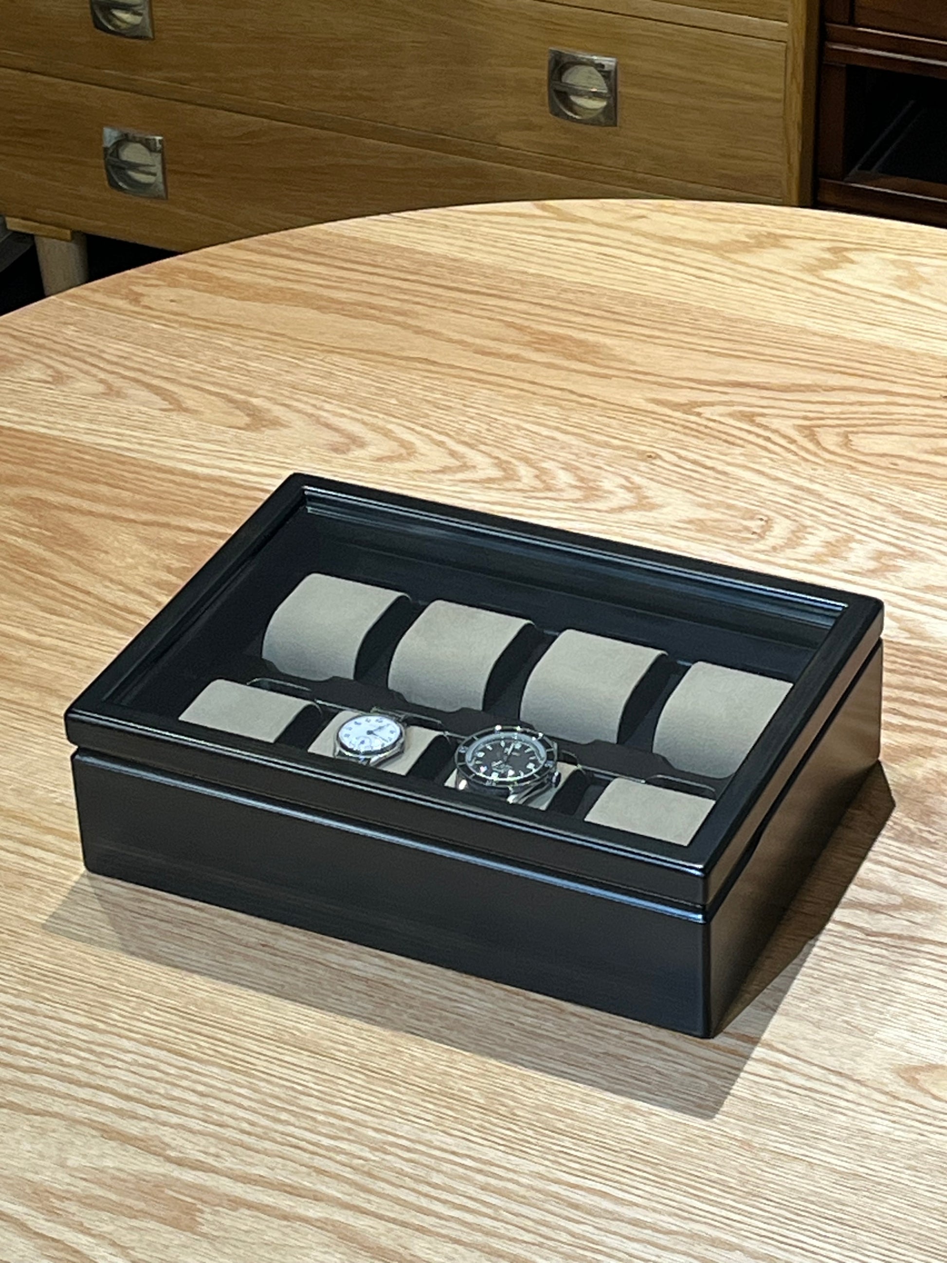 This storage case is a beautiful way to put your watches on display. Putting watches in is simple. Just place the watch on the cloth-covered wooden rest. You can elegantly display up to 8 watches. The surface of the rests and the bottom of the case are lined with raised fabric so you can store your collection safely. There is a lid with an acrylic window so you can view your watches on display. The lid pivots on the back of the case so you can open and close it just like a door.