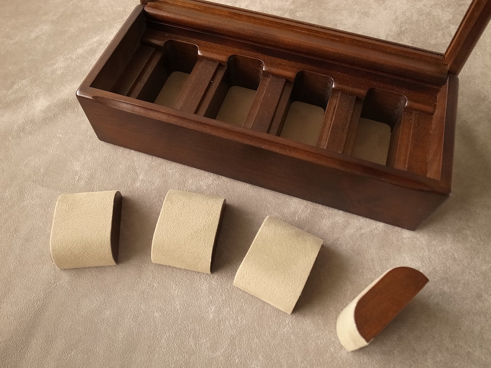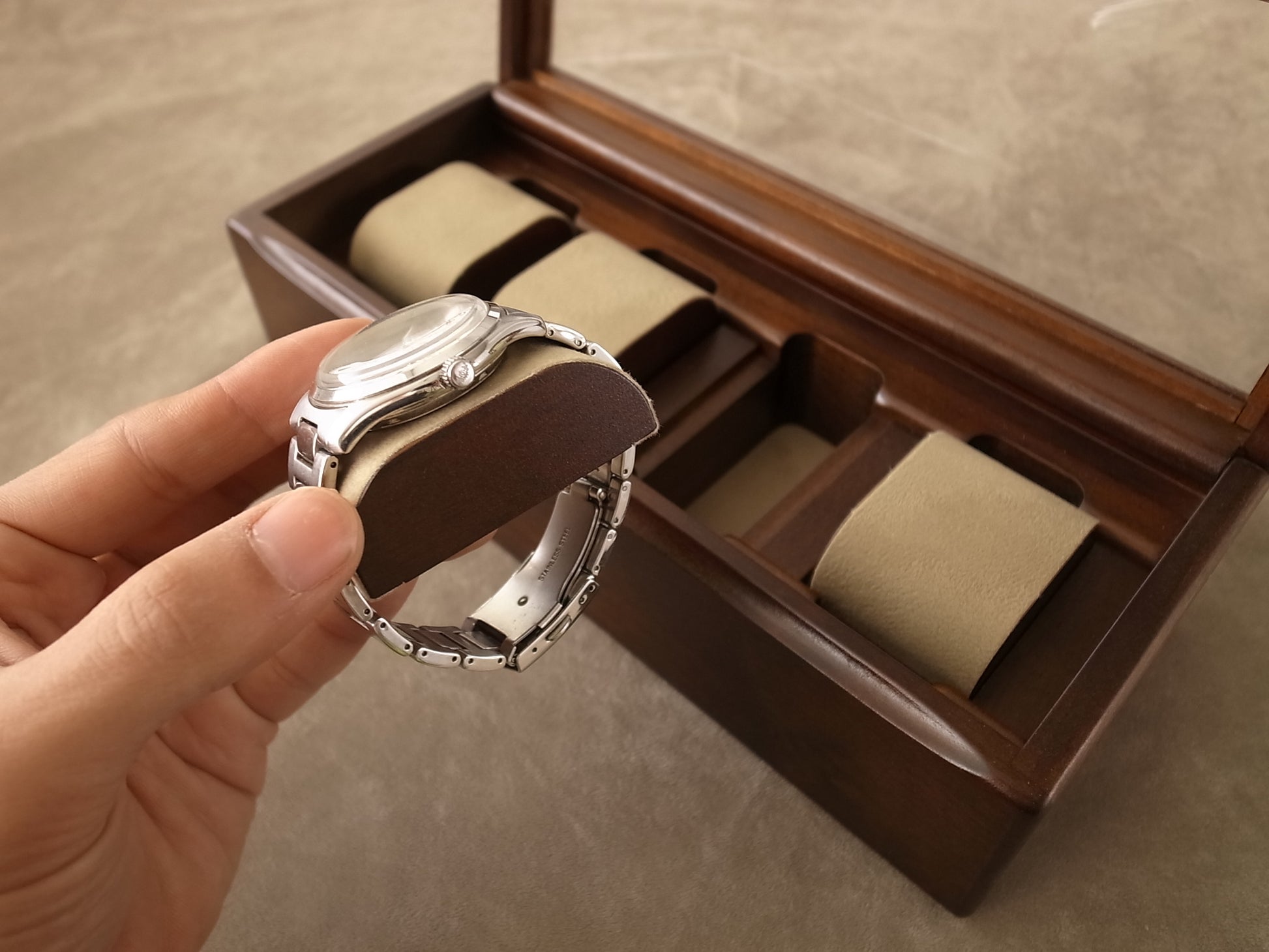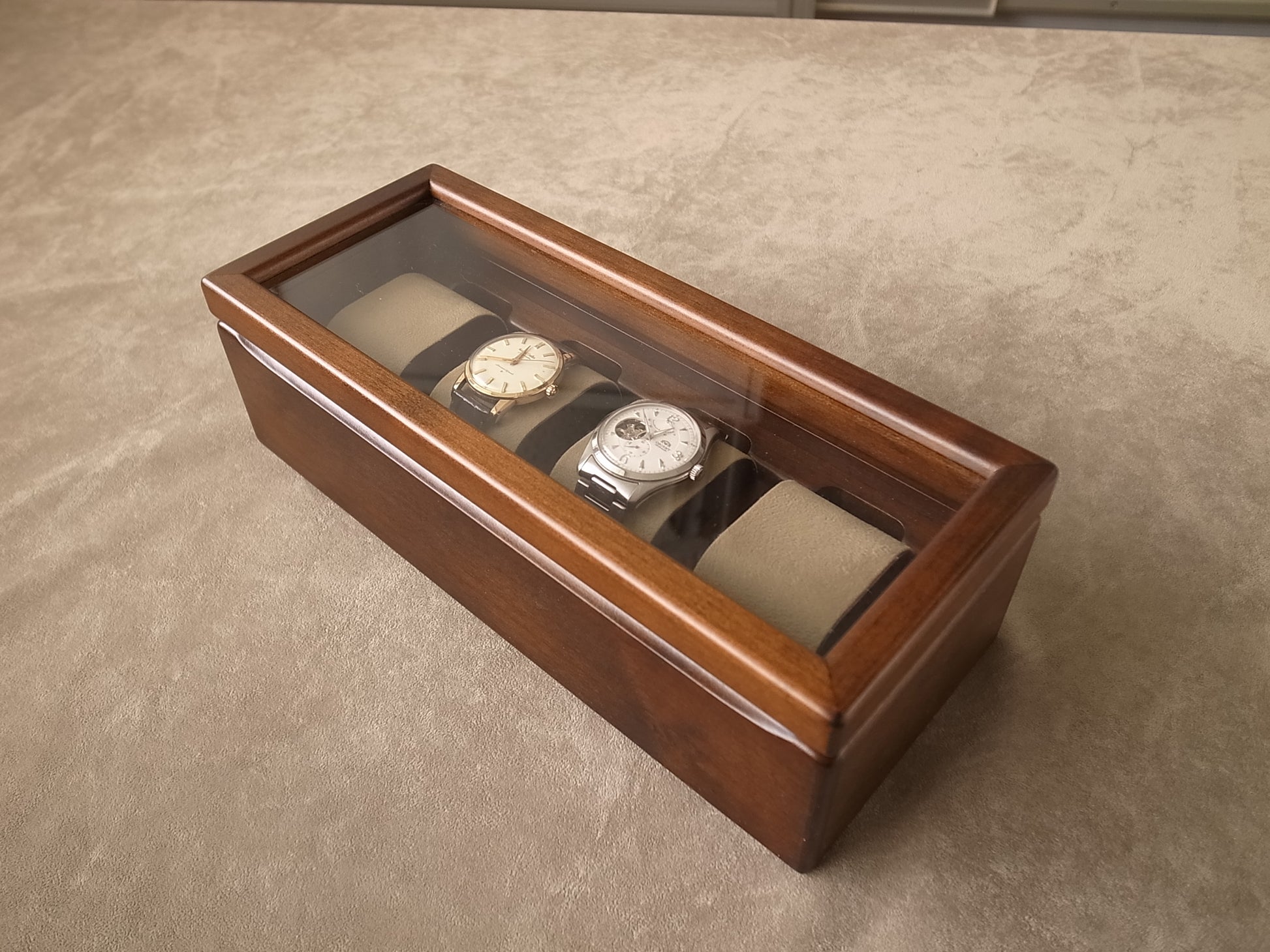 This storage case is a beautiful way to put your watches on display. Putting watches in is simple. Just place the watch on the cloth-covered wooden rest. You can elegantly display up to 4 watches. The surface of the rests and the bottom of the case are lined with raised fabric so you can store your collection safely. There is a lid with an acrylic window so you can view your watches on display. The lid pivots on the back of the case so you can open and close it just like a door.