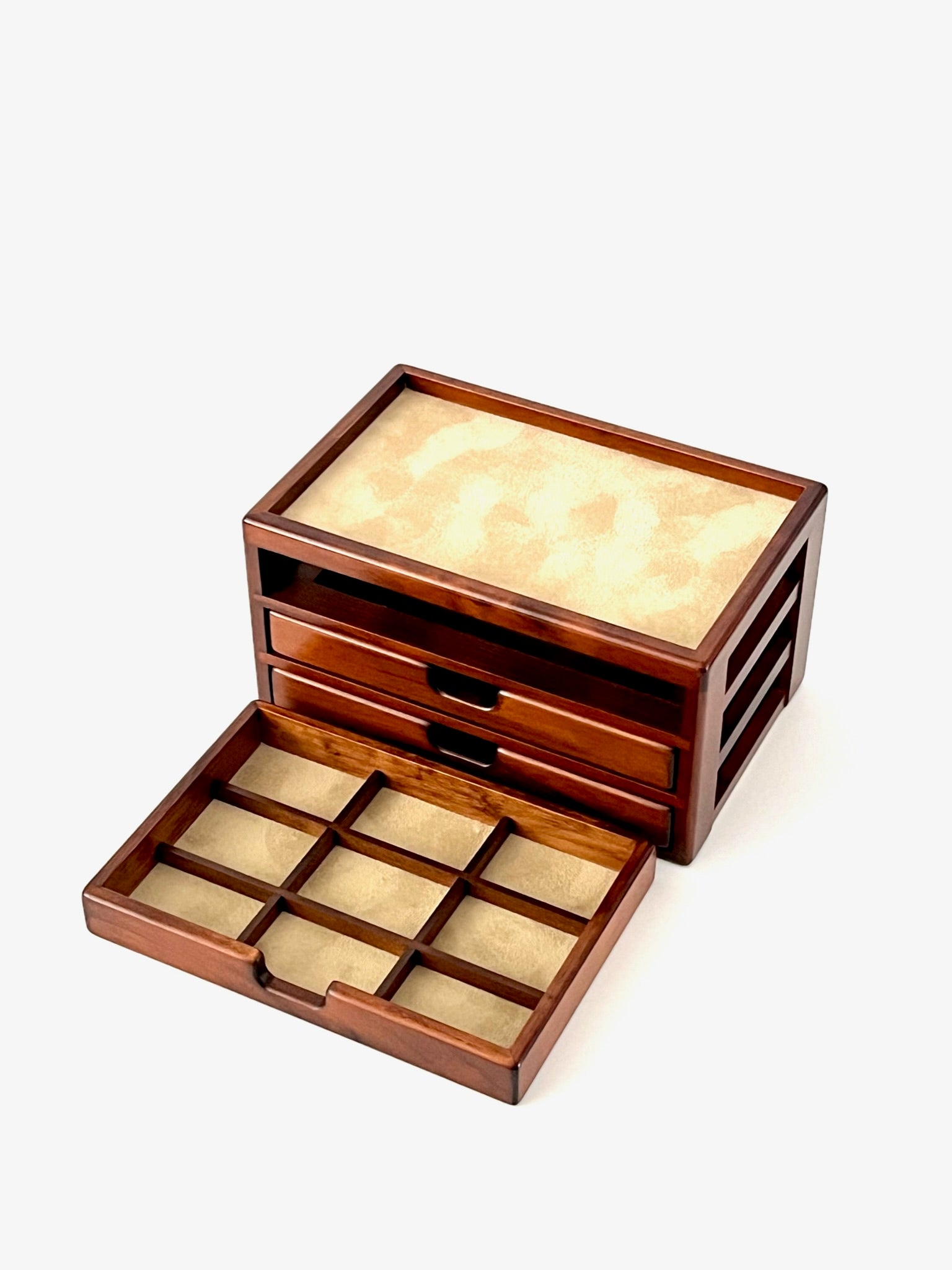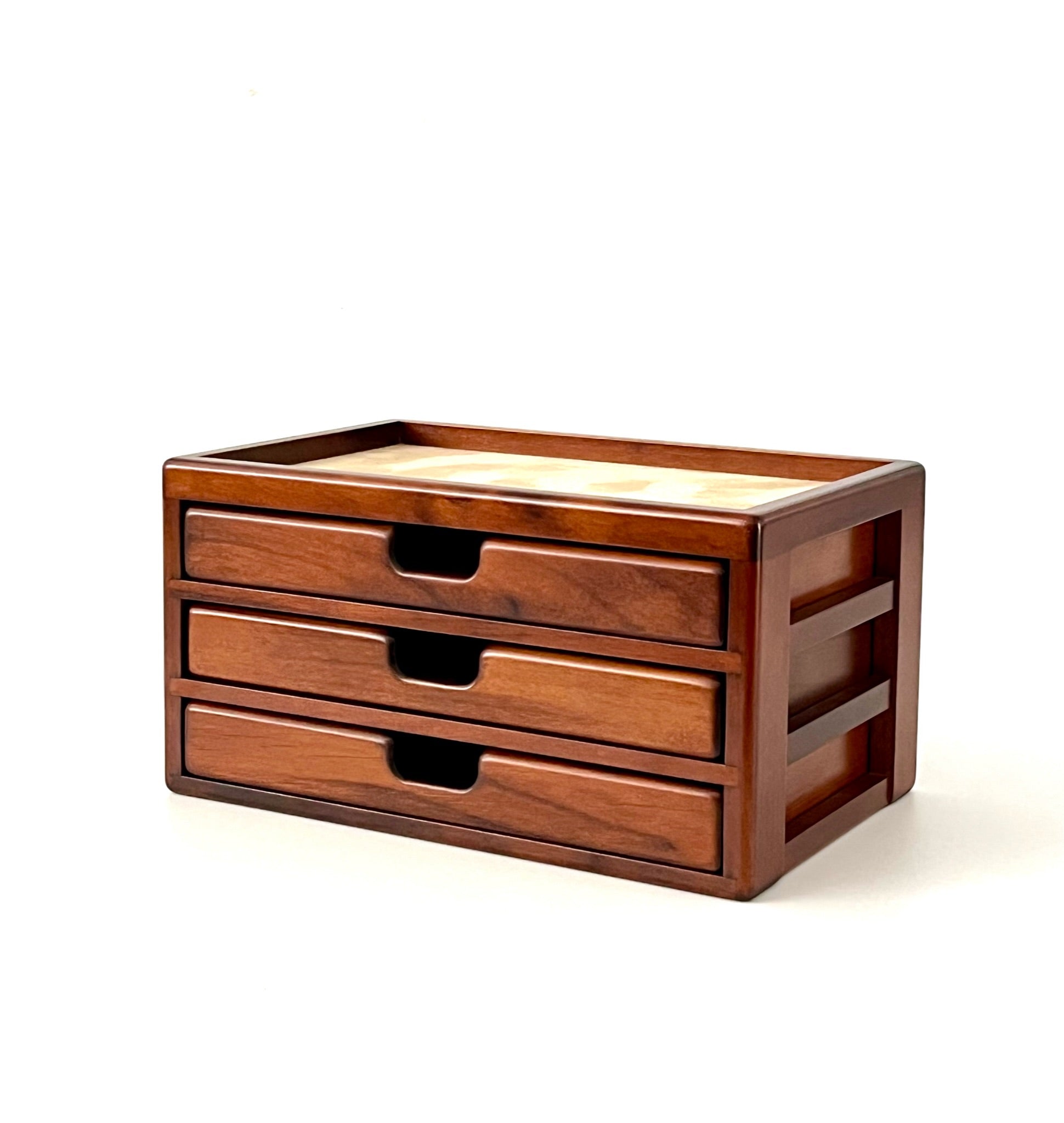 It features a compact three-stage drawer design, with three drawers that are easy to use and of a convenient size. This drawer is perfect for storing stationery envelopes, gift bags, and long-sized 4 standard envelopes. It is also suitable for storing various small items like memo paper and writing utensils. It stands out from ordinary drawers with its meticulous attention to detail. One of the three drawers has a removable divider and is lined with fabric on the bottom surface. It is convenient for organizing small items. Take a closer look at the drawer, and you'll notice that not only the front but also the inside, sides, back, and bottom are hand-polished and carefully painted. Even if you remove one drawer and place it on your desk, it serves as a functional standalone tray.